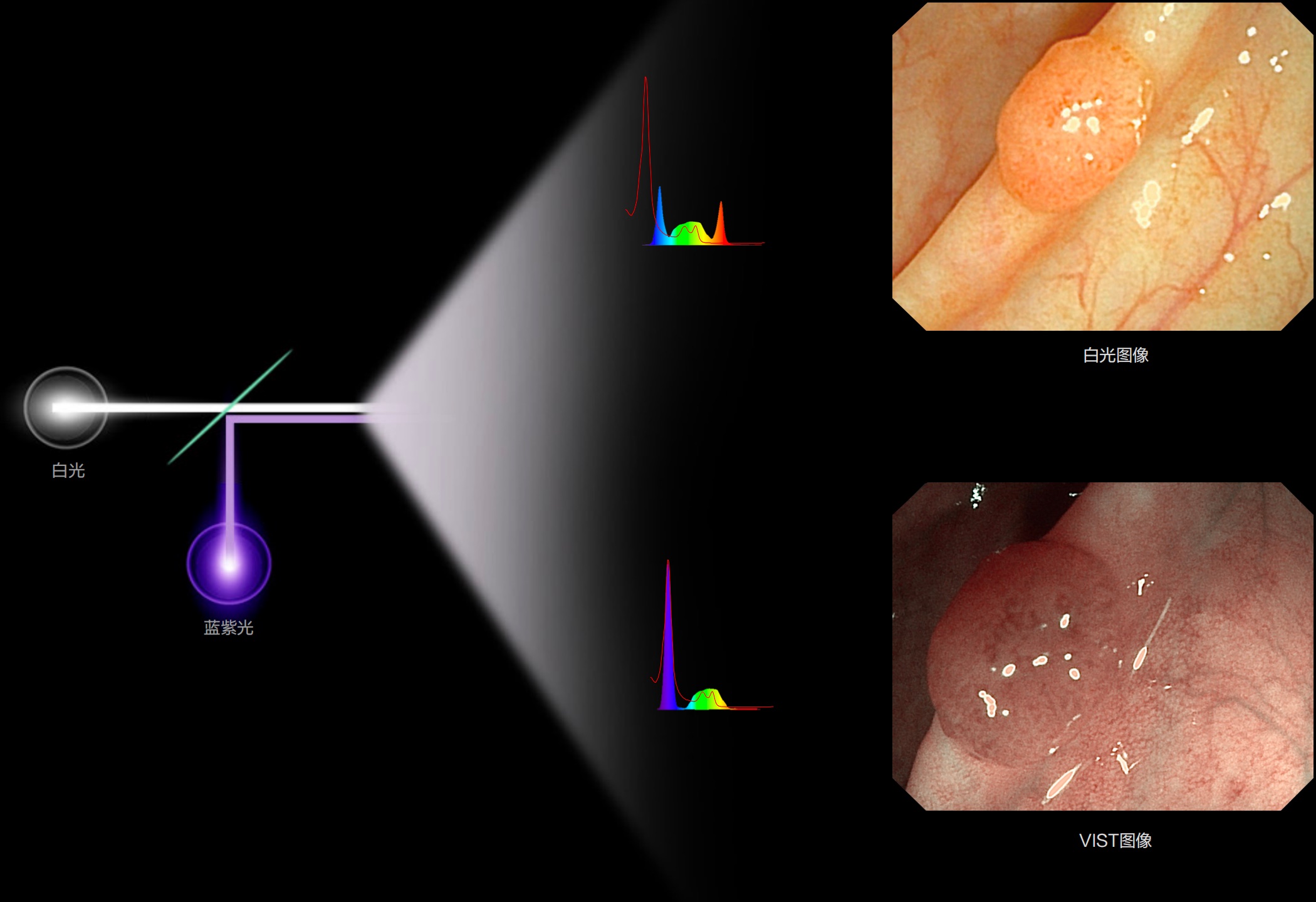 能够凸显黏膜浅层血管轮廓和黏膜表面微结构,适用于中、近景观察下的早癌精确诊断。